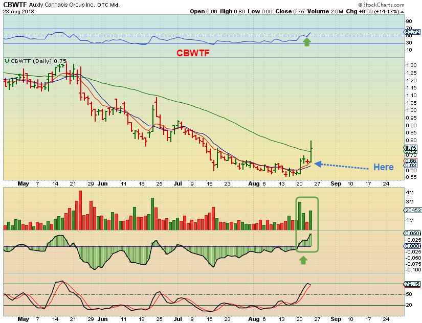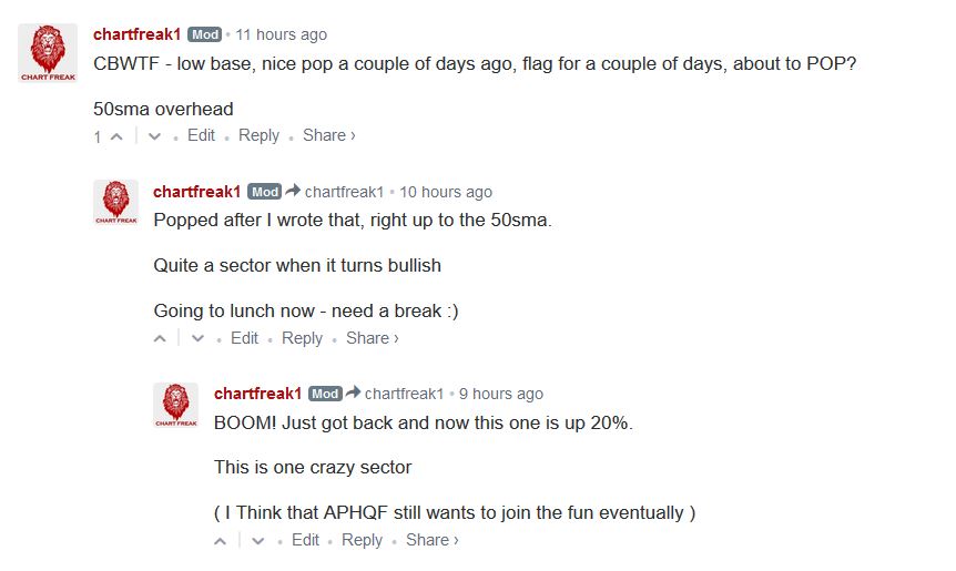 CBWTF NOTES –  These were my notes from the comments section.  I had mentioned that I owned this one days earlier, along with CRON, CANN, CGC,  and a few others.  It too looked ready to POP and you can read what I wrote in the comments section here….