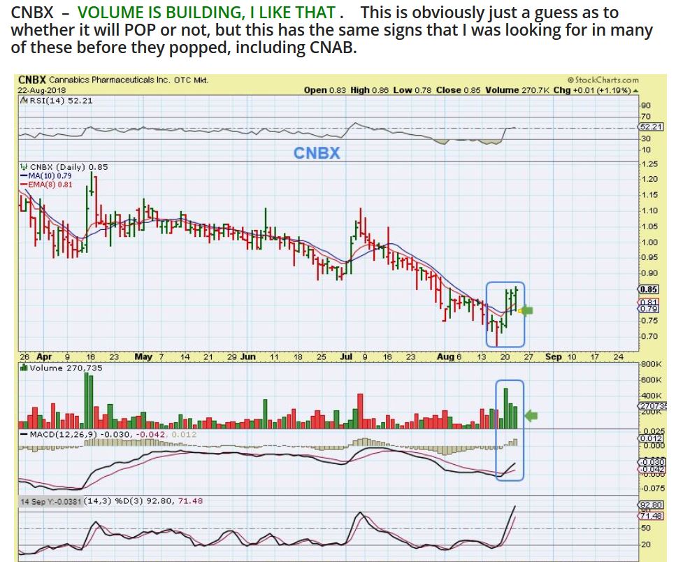 CNBX ( Copy / Paste )FROM YESTERDAYS REPORT- I called CNAB as an MJ stock that would POP, and it was up 40%  Then I said,  “Do you want to know which one is next?  It is CNBX”.
