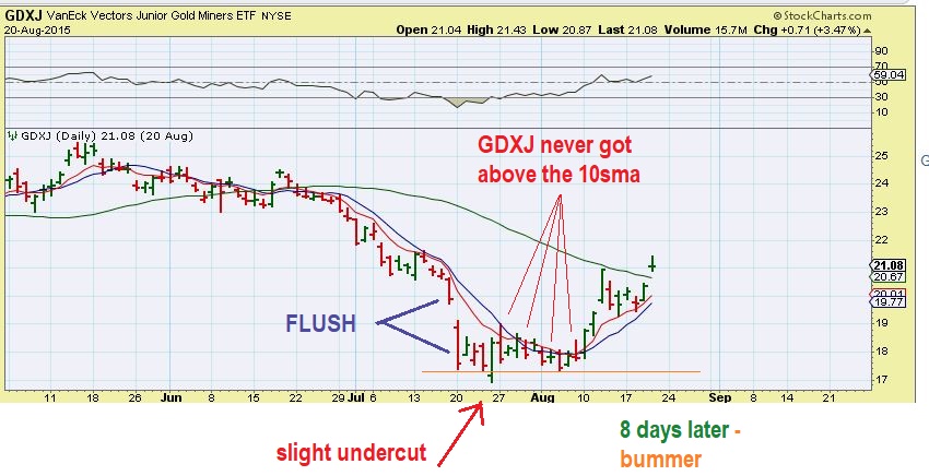 GDXJ –  Look at the ‘FLUSH” in July 2015.  It then made a SLIGHT lower low or undercut,  just to shake out the early buyers.  It also went sideways along the bottom of the 10sma.   Again,  the safer less frustrating buy was a close over the 10sma.