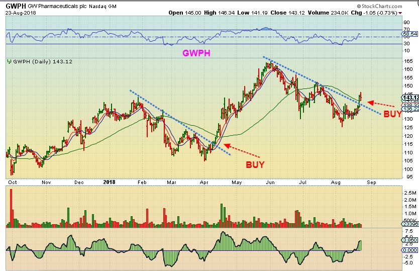 GPWH – A NASDAQ PHARMA in the MJ SECTOR is now a buy too.  Look at a 5 year chart of this one.  It was under $10 just like CRON 5 years ago, now it is a buy & trades near $140.   CGC & CRON may have bright futures!  ( Though the rise can be choppy at times).