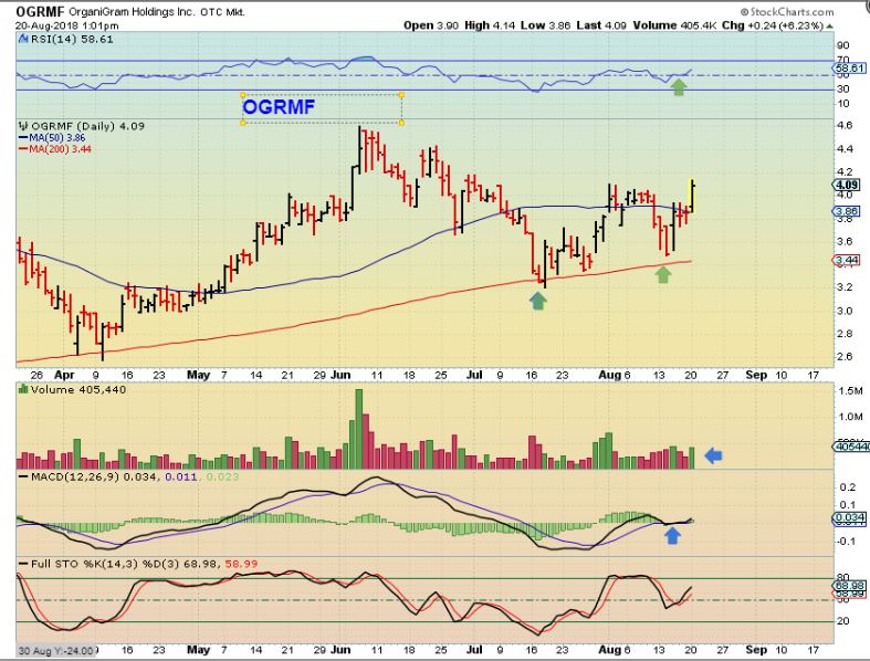 OGRMF-  Also from AUG 20   OGRMF  was moving back toward the former highs.  This was a  BUY either as it broke the down trend line ( Not shown) and the 50sma,  or  after bouncing off of the 200sma.  It is still a buy in my opinion…