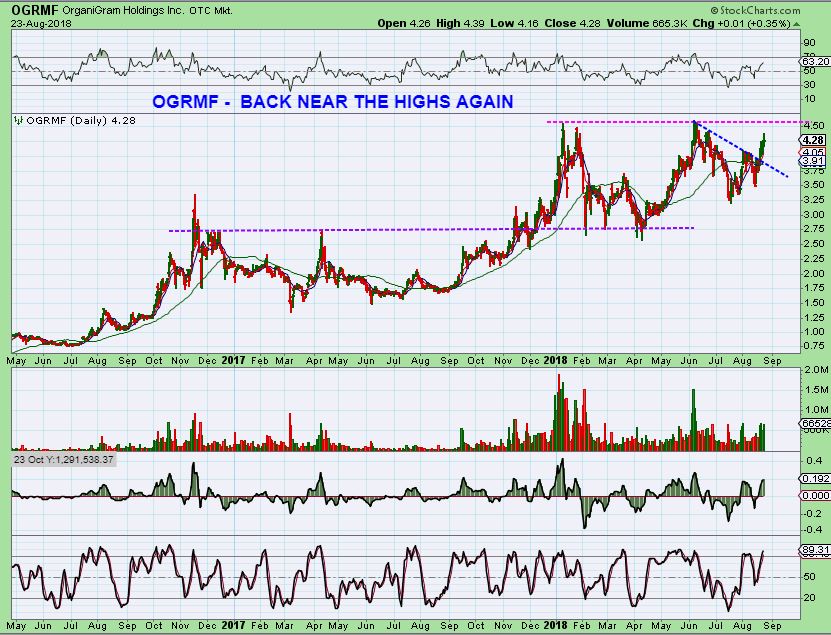 OGRMF – It has slowly,  day by day, climbing higher.  This is acting bullish long term, but HAS NOT been an easy ride.  We rode this one last year Oct through Jan, and I was stopped out eventually.  If this breaks the highs, it could just continue higher.