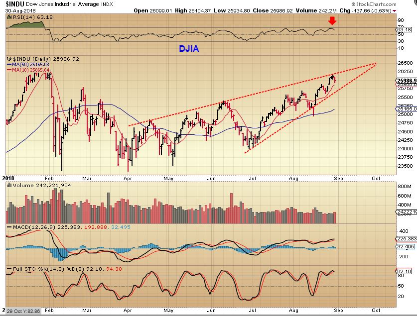 DJIA – The DOW has not broken to new all time highs, but it reversed at the upper trend line too.