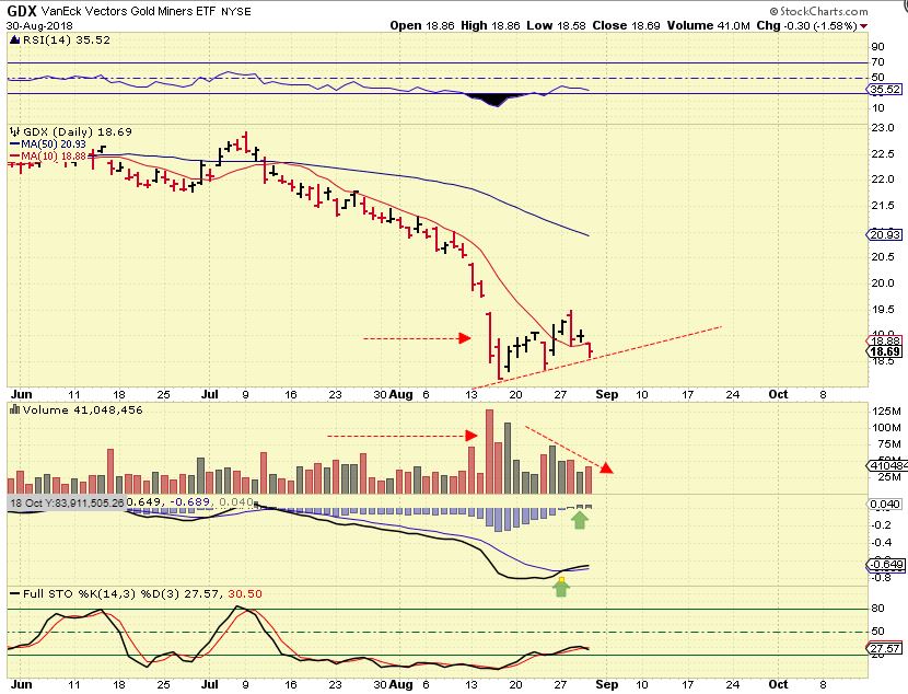 GDX – THIS WAS GDX AS OF THE CLOSE THURSDAY. This caused Panic, Fear, and dread pertaining to GOLD? GOLD is $40 above the lows. Maybe some here (NOT ALL) should Lighten their position on a bounce if it affected then emotionally. You do not have to buy at the lows, and yes, we could go lower. Buying near a choppy bottom is not easy for everyone. The 10sma gave way, but selling volume was light, less than 1/2 of the capitulation lows.