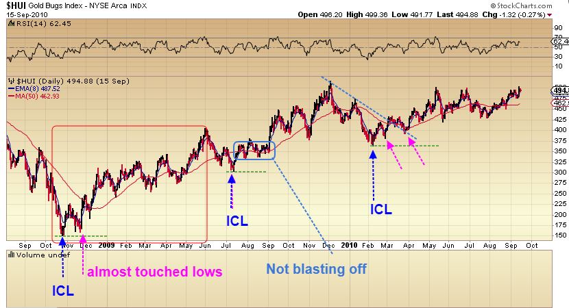 HUI ICLs – SO I WILL POINT IT OUT AGAIN. AFTER THE ICL OF 2008, 2009, 2010, PRICE DROPPED BACK TOWARD LOWS IN MANY CASES. It stalled for days. People were afraid. THAT IS NOT UNCOMMON. Look at 2008! LETS TAKE A CLOSER LOOK…