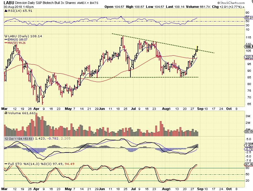 LABU – Meanwhile LABU broke out from the down trend and continues higher.