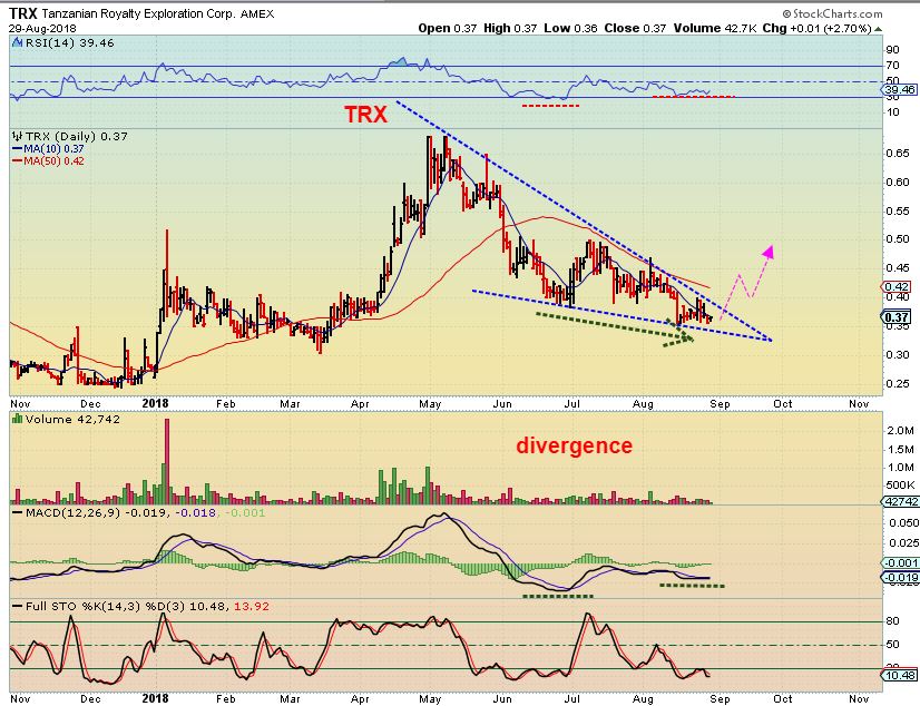 TRX – This is a junior Miner at the lows, but the divergence looks bullish. Don’t buy it, I’m just pointing out a junior Gold Miner after a day of gold selling that looks to be ‘setting up’ as a future buy. There are others that seem to be fine too.