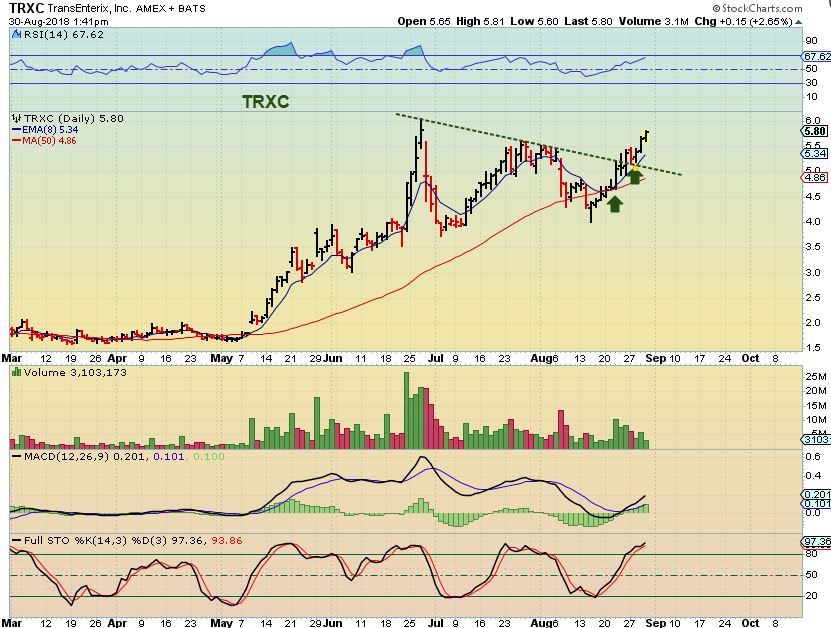 TRXC AUG 22– A BUY under $5, at the 50sma. It also was ready to break the trend line…