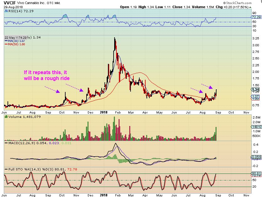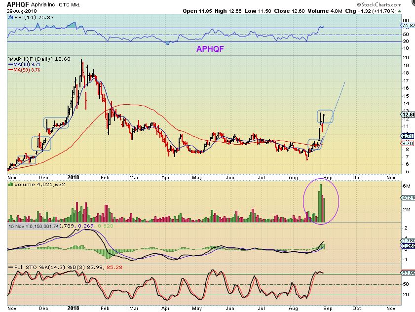 APHQF –  After a strong run higher, many MJ stocks also experienced a sharp pullback on Tuesday.  Wednesday saw the sector burst higher again and erase losses in many of these stocks  ( See  CGC, CRON, APHQF, etc). NOT AN EASY RIDE.   Is this now going to be an easy ride, straight up to $20 from here?