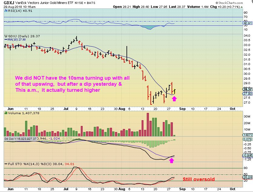GDXJ– The 10sma is turning higher.