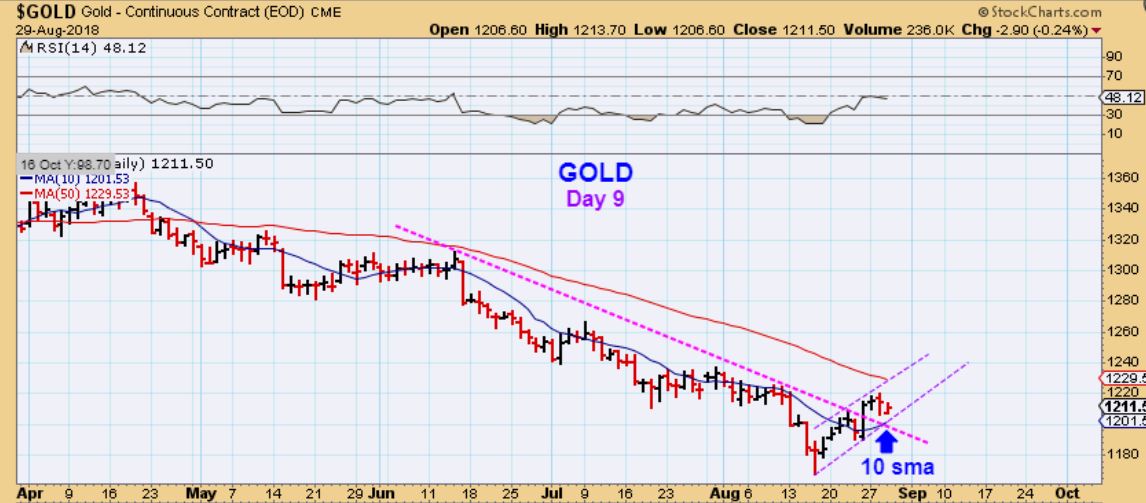 GOLD –  Gold is on day 9, it broke the down trend and remains above the 10sma.