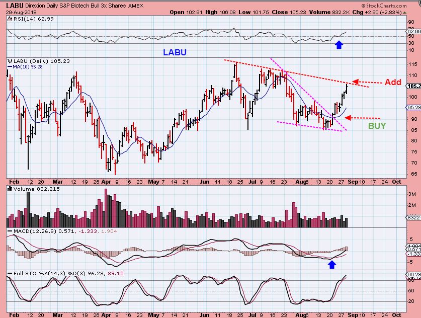 LABU  – The LABU trade is still following through too.  At this point, his MIGHT crawl along the trend line or it might just break out higher,  but I still like the upside potential here.