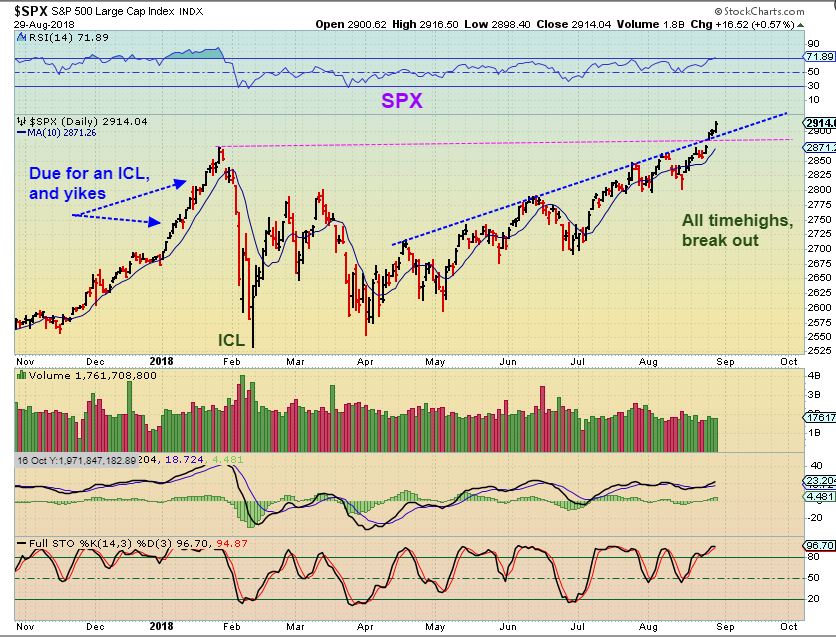 SPX –  We have a break out to all time highs in the SPX.   We are actually due for an ICL,  so how should we view this?  I have mentioned trade ideas for TNX, TQQQ and UPRO with stops ( rising stops), and said that I would be ‘cautiously optimistic’.   Let’s look a bit closer…