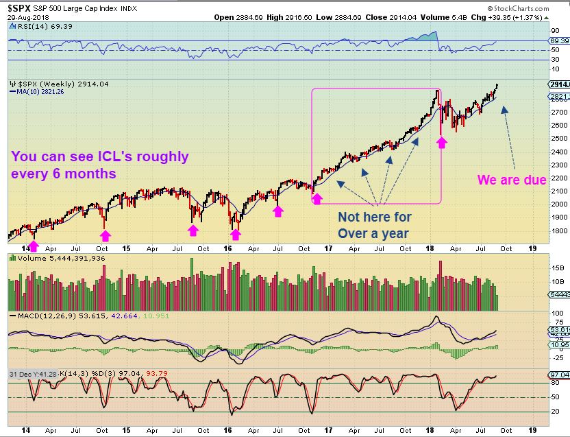 SPX –  You can see ICLs roughly every 6 month  ( deeper than normal dips). Our last one was February, so we are due.  Here I am pointing out that in 2017, we did have a period of strength after a consolidation break out where a real discernible dip could not be found for about a year.  The 10 weekly ma was hardly broken, right?  So this is why we can be ‘cautiously optimistic’ about going higher and use a trailing stop. That said, we are due for a dip.