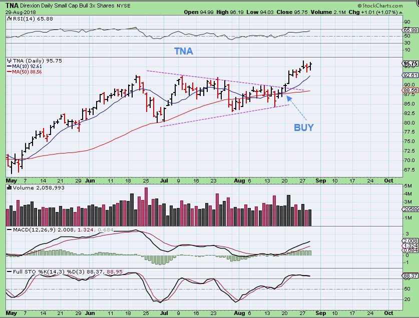 TNA –  This trade is still doing well.  I personally did not take this trade, I focused on Miners and MJ stocks, but so far this run is acting correctly.