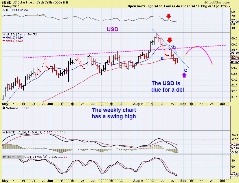 USD–  The USD is due for a dcl too. That does NOT mean that it will rally to new highs, it means that it is due for a bounce, and I expect the USD to eventually roll over.  We have a weekly swing high in place too.