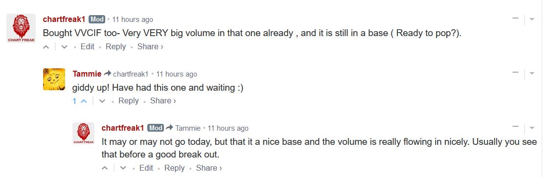 VVCIF  –  I mentioned that I bought this in the comments in the morning. I had a small starter position after Tammie mentioned it one day, but now Volume was very big in just the first 15 minutes. It was $1.18 and inside of a base.