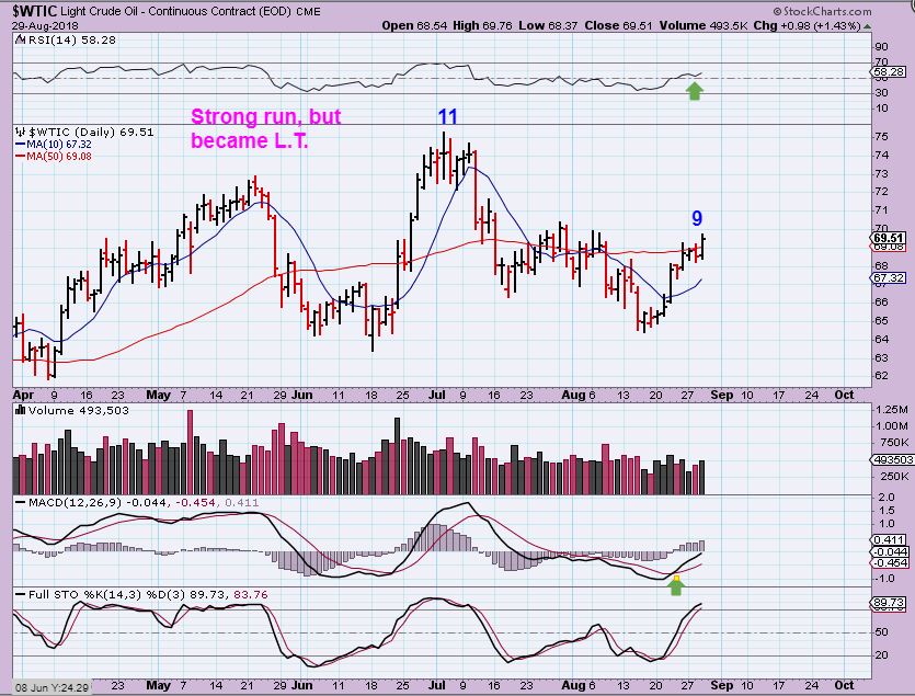 WTIC –  Oil broke above the 50sma on Wednesday. Due for an ICL, and with the last daily cycle being very L.T., I would  expect this to also peak as a L.T. Daily and then break the recent lows into an ICL.   The JUNE run looked very convincingly strong, but rolled over after day 11.  I am not going long or short here. Visually, we may form a right shoulder here.