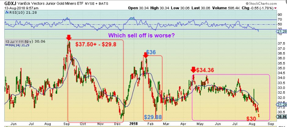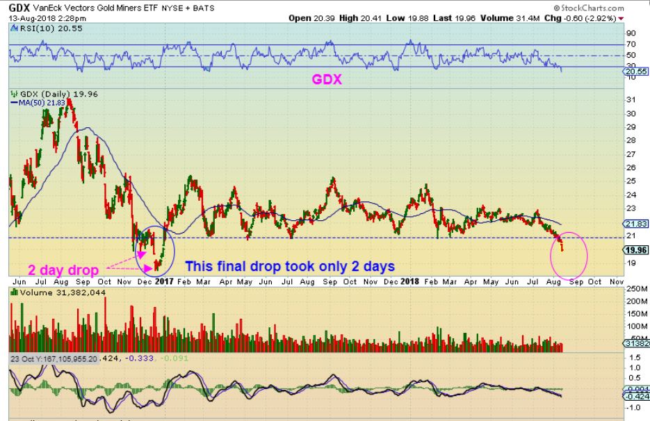 GDXJ – On AUG 7th, I drew this and pointed out then that the final drop in December was a sharp break and 2-3 day slam down … boom, boom, boom. I was expecting this type of slam down as a possibility.