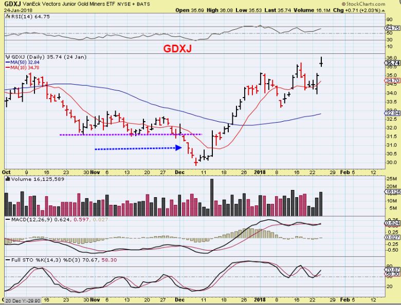 GDXJ – Look at that December drop close up. That doesn’t look scary, but if todays 1 day drop was , then this one had to be scarier. Also look at the rally that followed. Each 5 days/ candles is a week of trading. That’s a nice multi week rally, so there is no major reason to feel the need to hurry in and buy the lows. The cross of the 10sma was day 4.
