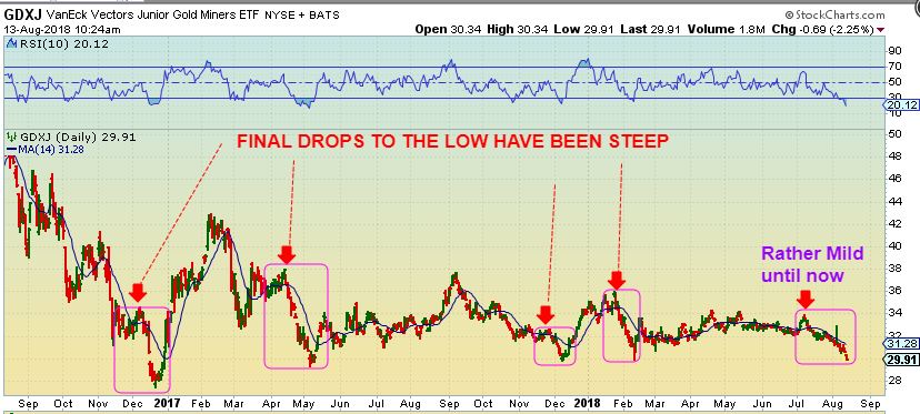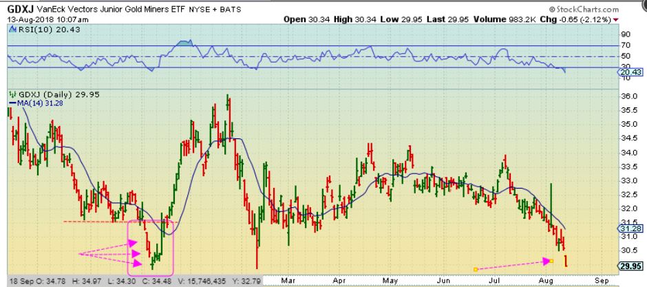 GDXJ – Since then GDXJ paused, went sideways, and is now dropping into that type of slam down. How many days will it be? We can’t say, but it’s best not to try to catch the falling knife, wait to buy the SWING LOW after a reversal.