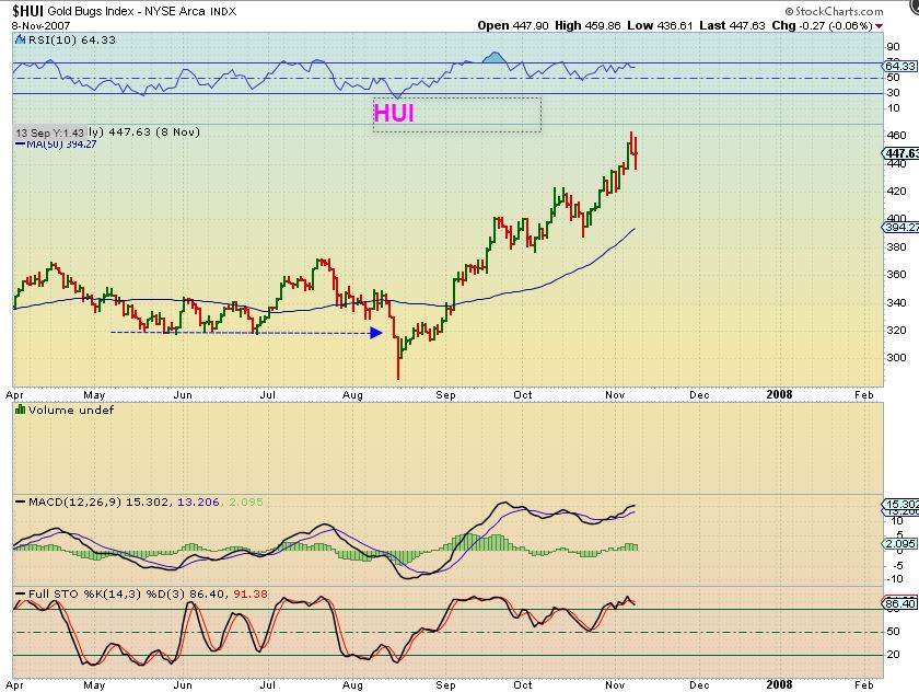 HUI – That is what we often see. Notice the drop drop drop In 2007. The HUI dropped Boom, Boom, Boom, done. And then a great rally followed.