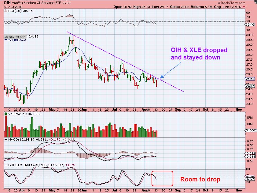 OIH – The Energy sector ( OIH & XLE) dropped and actually closed at the lows, so Oil may not be ready to put in the dcl yet. The DRIP & DWT trades have benefited from this weakness.