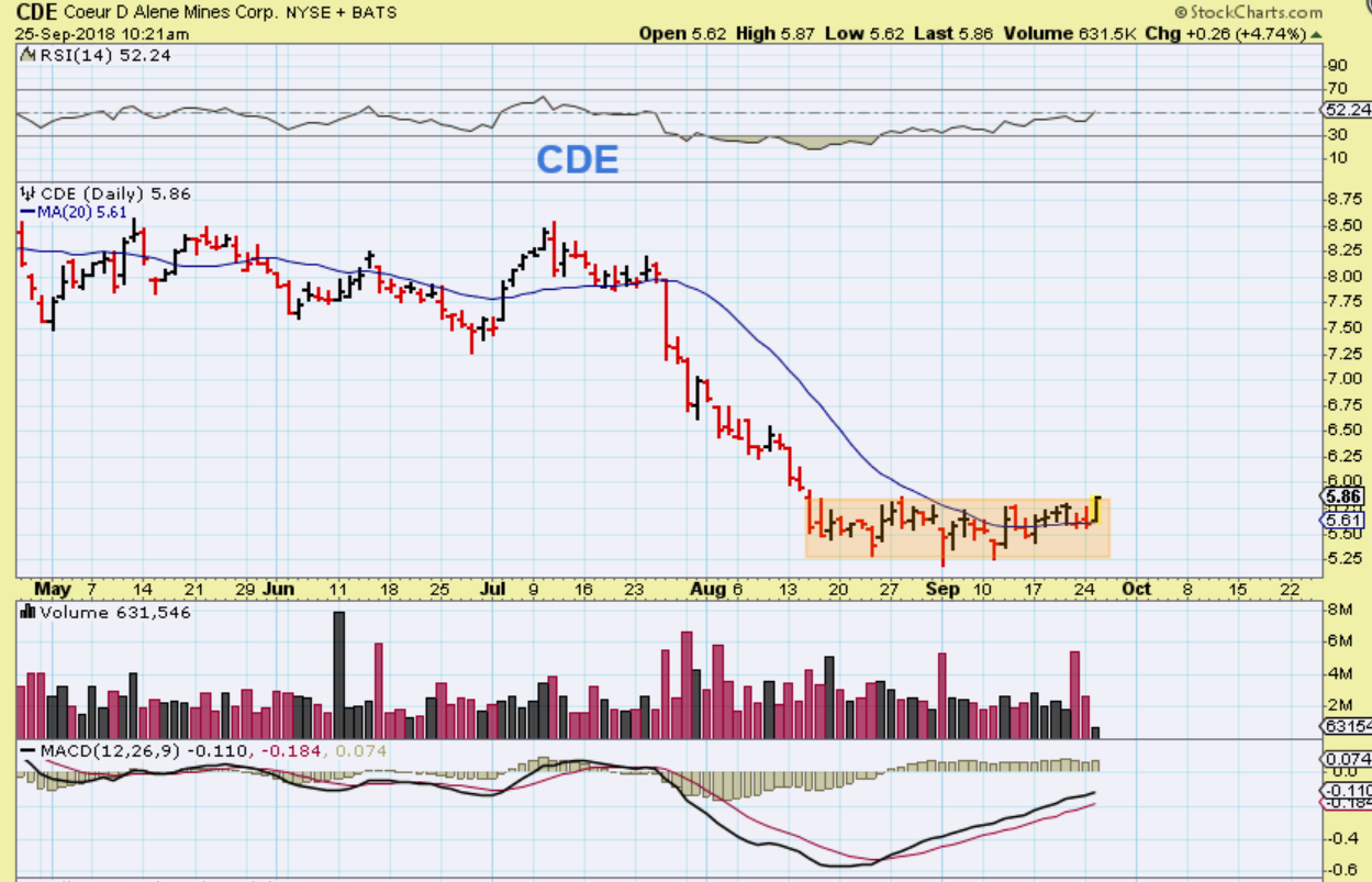 CDE – I Grabbed this chart to point out a nice base developing in CDE. After the FOMC Mtg, re-visit this chart and see what you think. A break from a base could run very nicely.