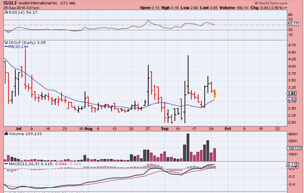 ISOLF – Toward the end of the day a recovery. A reversal formed by 3:30. By the close, this did actually go slightly red again, but my point is that these move in a very big way, and this is still a bullish chart. That 2 day POP in September was $2 to $4.50, so you have to expect large swings after that. It will NOT always just go higher.