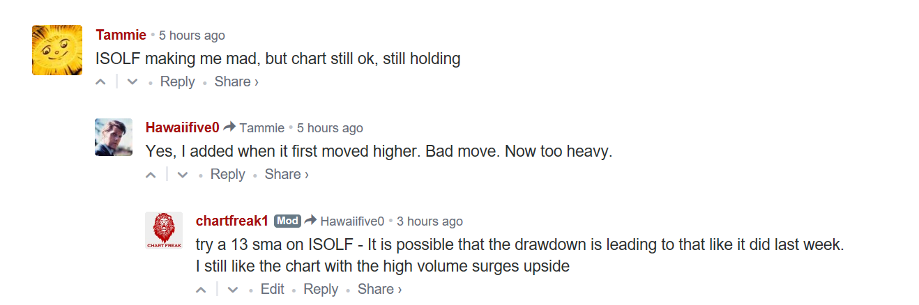 ISOLF – This was a discussion in the comments about ISOLF. I am using the 13 sma for ISOLF, I own ISOLF too. It was down maybe 15- 20 cents for a while Tuesday morning…