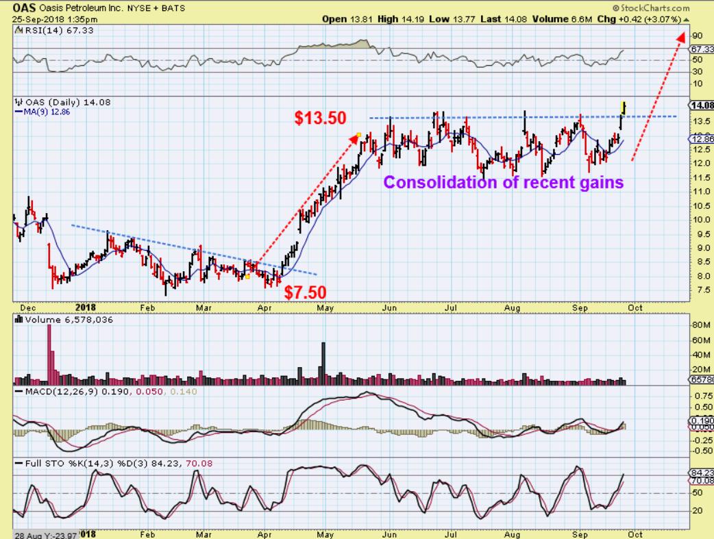 OAS– Many energy stocks that were mentioned in the report yesterday, ( See charts of WTI, HOS, etc) broke higher. OAS looks great too, as it breaks from a multi-month consolidation..