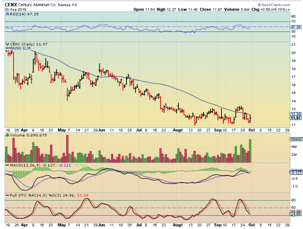CENX – I look for bases with a high volume pop like this, pushing on the 50sma. It is a choppy base so far, but with the metals sector moving higher, This is a buy right here with a stop under recent lows.