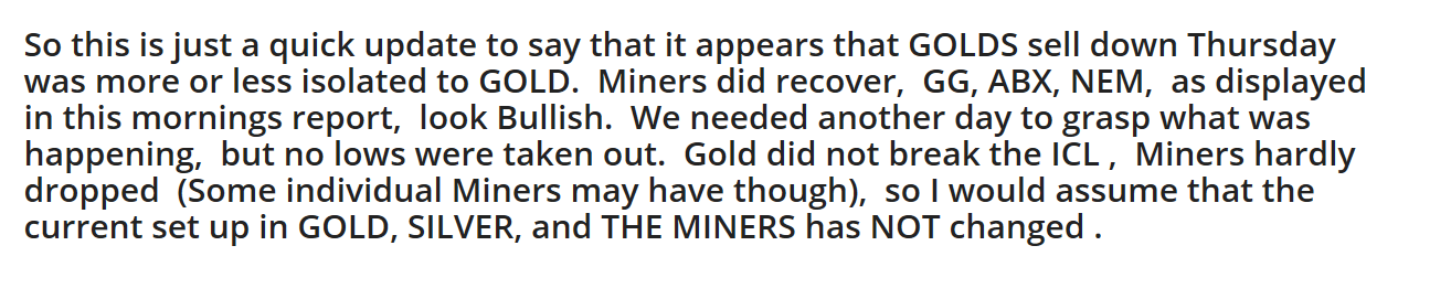 Do you remember when I said that on Thursday as GOLD sold off $10+, GG, NEM, ABX, and other Miners flipped higher & ended the day GREEN? Obviously that is a bullish event, but after even another day of trading, what conclusion does that lead to ?