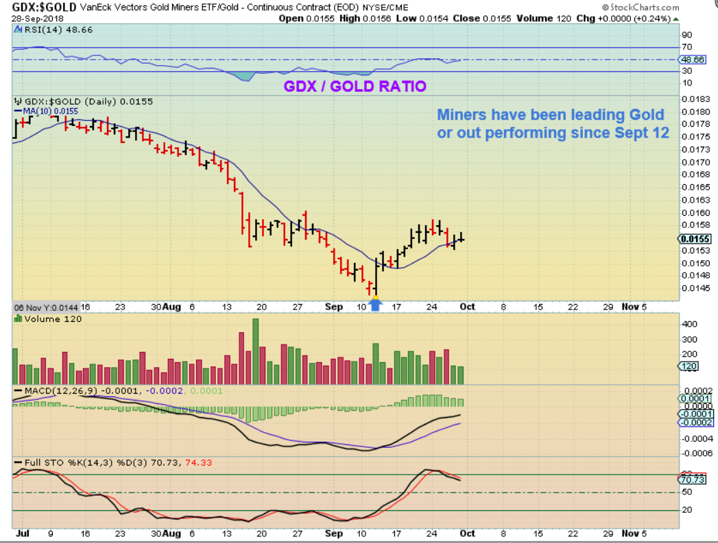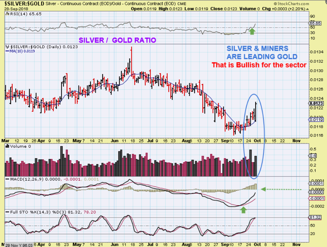 SILVER IS ALSO OUTPERFORMING GOLD – Look at the surge Friday in the Silver / Gold ratio. Thus we have Silver & Miners leading Gold. That is really what we are looking for or hoping for and that gives a more bullish outlook.