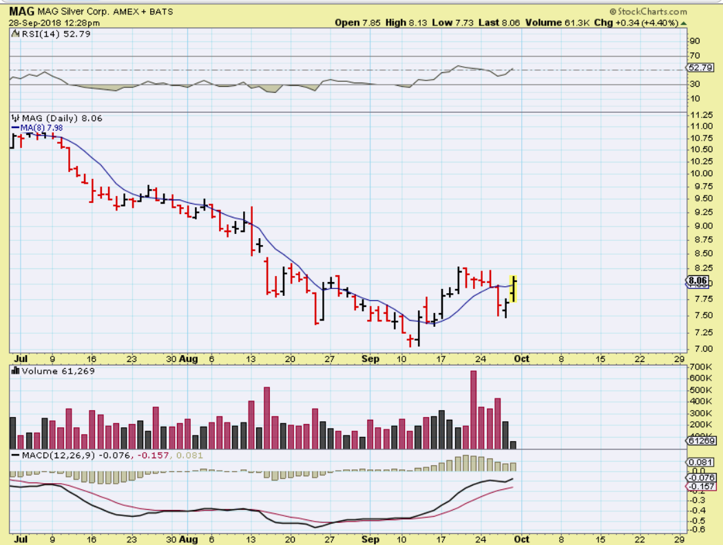 MAG – I pointed this one out in the last report ( Fridays Midday report). It closed higher at $8.11. Silver looks bullish , so now Silver stocks may begin to perk up.