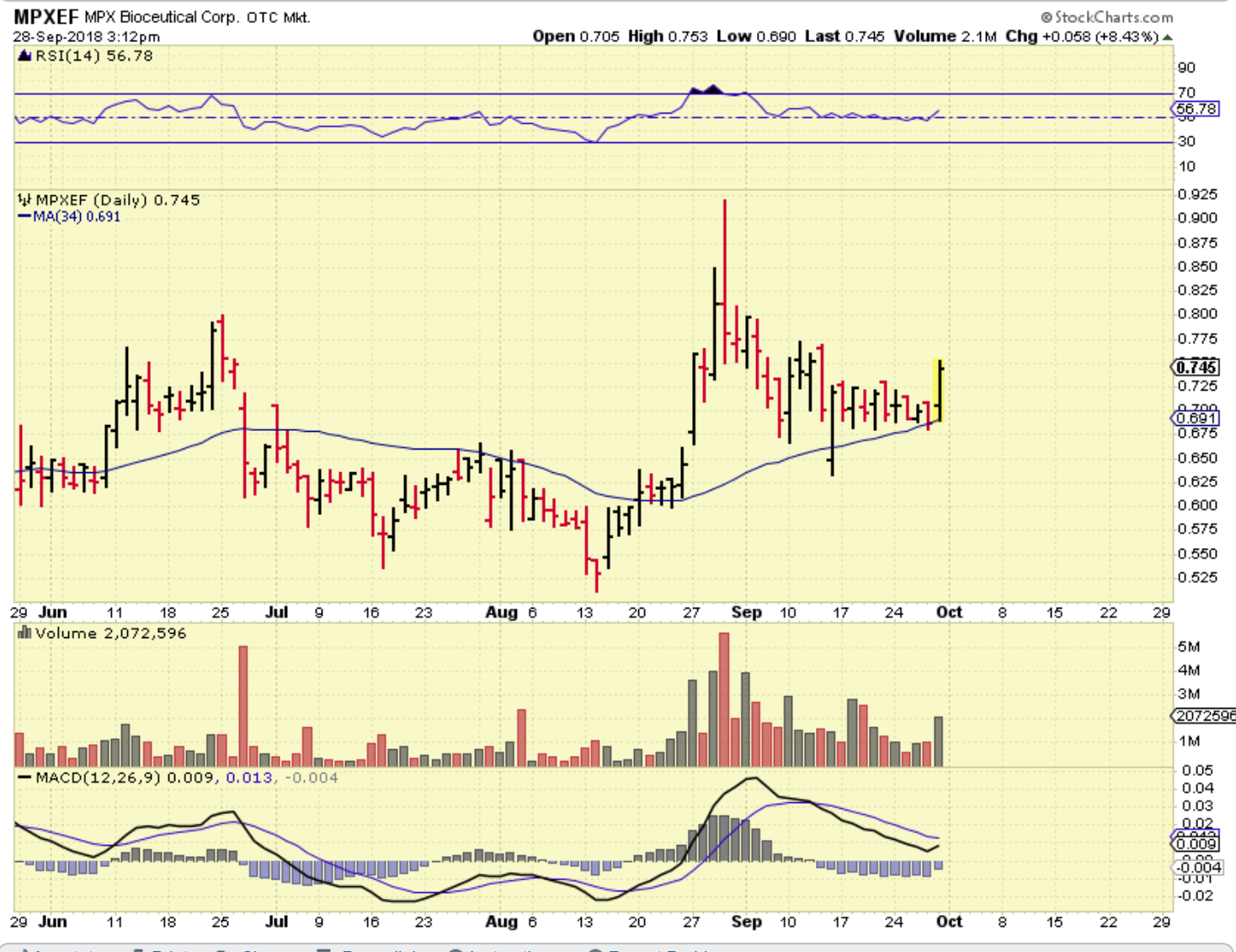 MPXEF – I bought this on Friday as it started to break out from this consolidation, after finding support on the 34 sma. I posted this in the comments section. It went on to close up 12 % and volume was very good.
