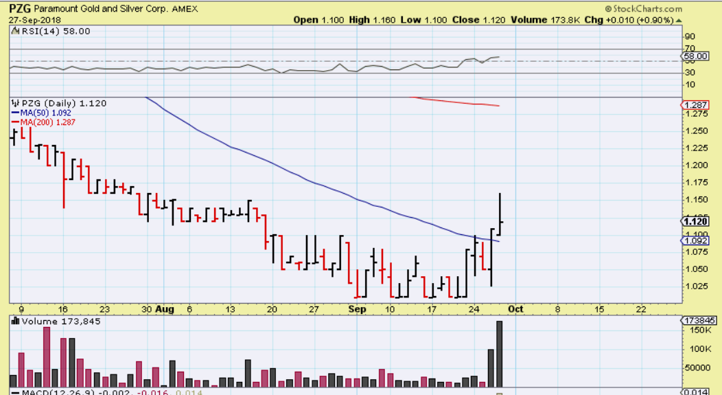 PZG – This Gold Miner had moved off of the lows with relatively strong volume for this one and broke above the 50sma. On Friday it dropped back down to $1.06 on only 29,000 volume, so this may be perfect for a watch list. That does put it back under the 50sma, but that 2 day pop may be signaling better things to come. It did run from $1 to $3 in that Jan – Aug run of 2016. Note: I do not LOVE this one , because of the lower volume, but in a bull run move, $1 to $2 would be nice gains.