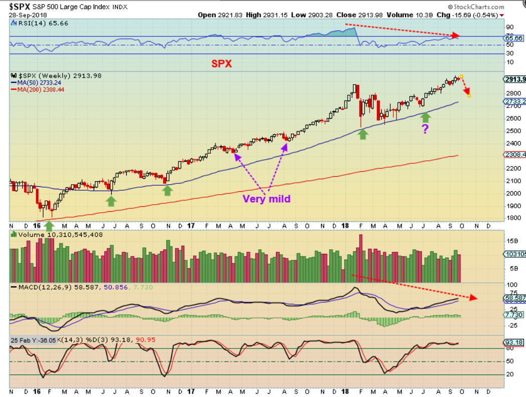 SPX WEEKLY – The SPX is due for a drop into a DCL / ICL. Here I am pointing out the Obvious ICLS that occur just about every 6 months, and then we had some mild ones with small sideways moves in 2017. 2018 had a sever drop at the start of the year, and now we have had a fairly steady climb ( Choppy stairway at times). I would still have to say that we are due for a pull back though. I see strong divergence not confirming the recent break to new highs.