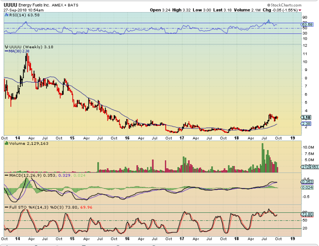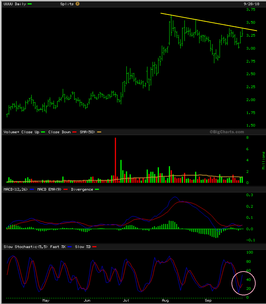 UUUU- Still on track ( I own it) – It almost broke out on Friday, but sold off into the close. One could wait for a break out if they want to avoid the possible further consolidation.