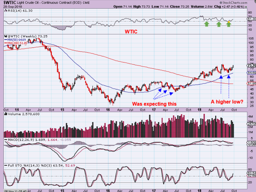WTIC – I expected a deeper dip in Oil, to lower lows as seen in April to July of 2017. Even that one did a drop, rally, drop, rally, drop. SO far Oil currently has moved almost back to former highs , and I noticed that quite a few energy stocks flipped to bullish too. Oil right now rallied out of a dip that I expected to go a bit lower.