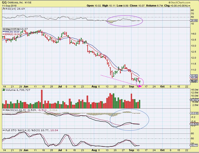 And then there are the Precious Metals. Gold dropped at the open and then reversed higher, and so did the Miners, but they are still currently at the lows. Since they gapped down and reversed higher on Tuesday morning, we’ll see if they can they get any follow through higher, especially to break above the down trend lines and 10sma? We could get BUY opportunities in individual Miners if we see improvement. Time will tell.