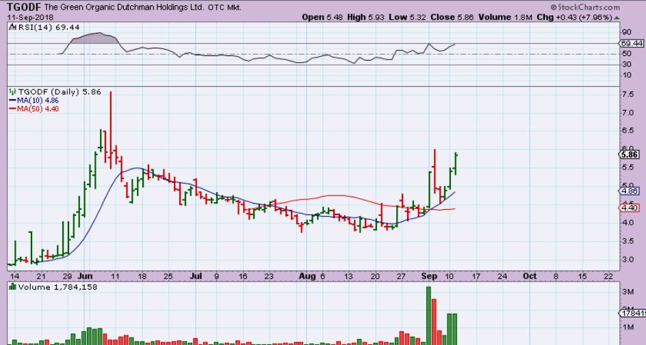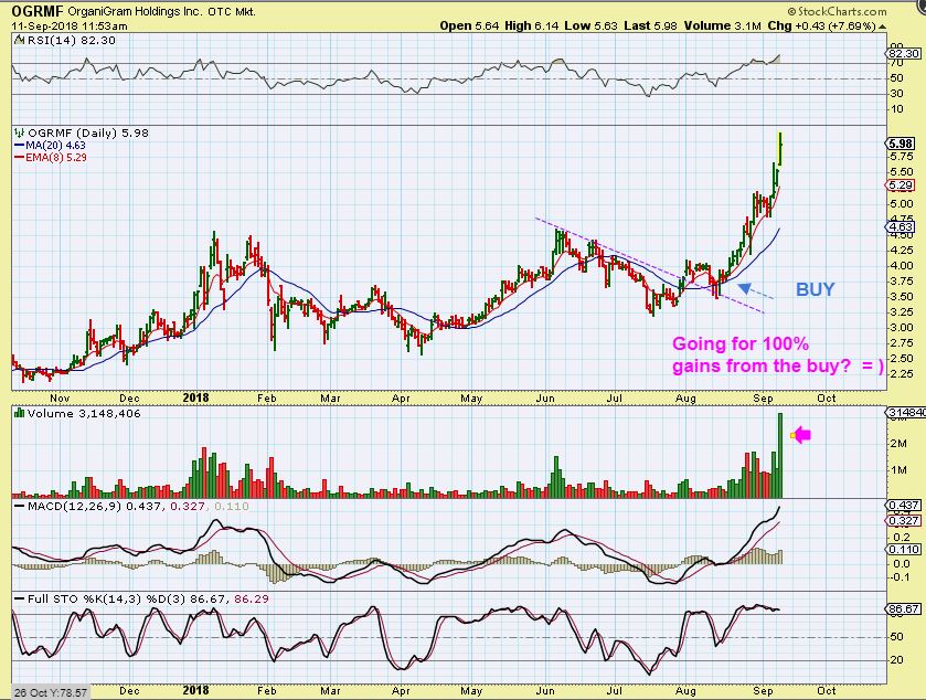 OGRMF – Here it is near $6. It looks extended, but these do just continue higher. I dont know exactly when to sell since these over extend, but do lock in some profit. And even if it pulls back, it may consolidate and run again (This did at the end of August, it formed a flag).