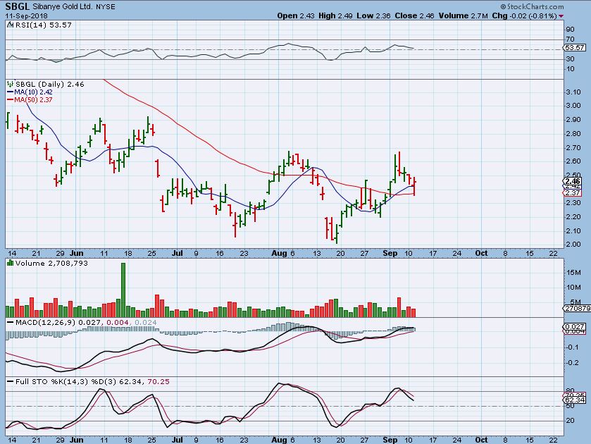 SBGL – SBGL & HMY have been leading off of the lows. This bottomed almost 1 month ago and bounced bullishly off of the 50sma. SBGL is a buy using technical analysis.