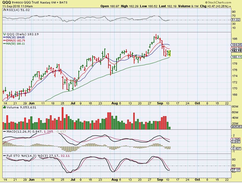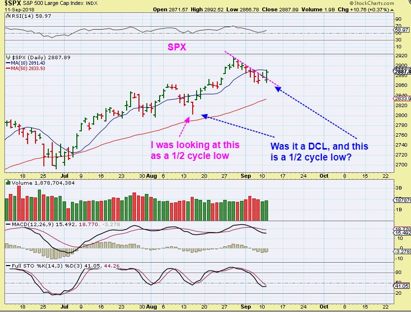 SPX – SPX is still below the 10sma, so we’ll see if it breaks higher on Wednesday. Now I have to wonder if Mid Aug was a DCL ( it looked more like a 1/2 cycle low to me), and that would make this dip a 1/2 cycle low with another bounce higher.