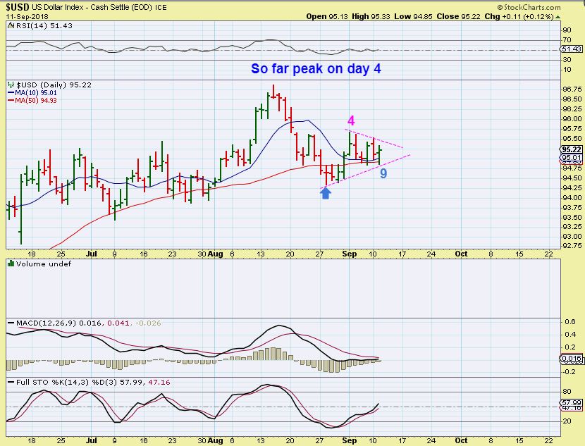 USD – The USD has a peak on day 4 so far, and it remains left translated if it stays under $95.75. It is holding above the 50sma. We are on day 9.