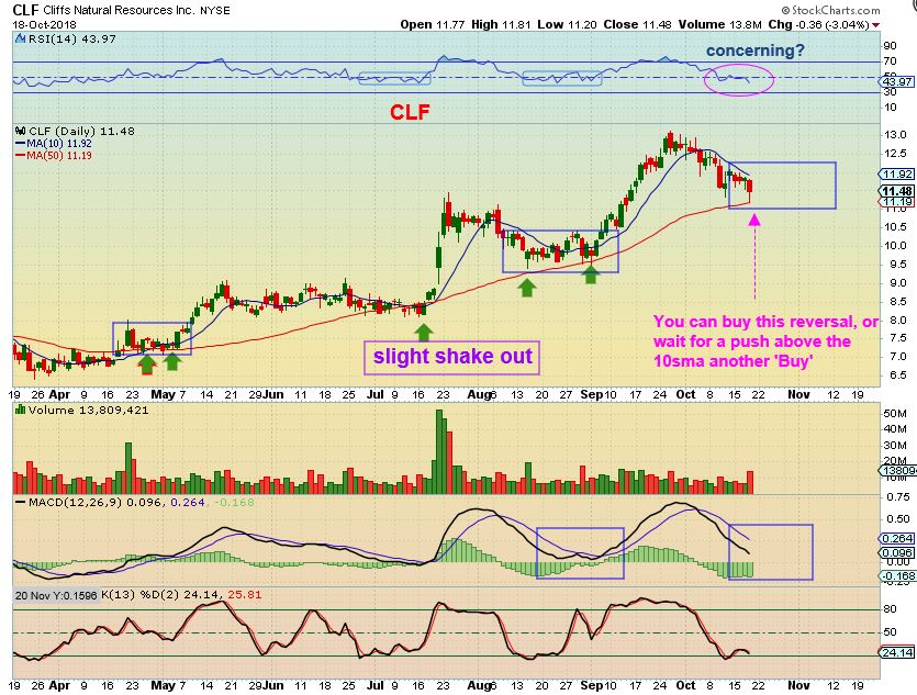 CLF   OCT 18th  –  I  mentioned how CLF fumbles around the 50sma in the past.   I was viewing it as a possible buy in this area, but also I noted ‘beware of the choppiness around this area’. Notice the choppiness in the blue boxes.  The advise in Magenta writing was also ” or wait for a push above the 10sma to buy‘.  Well…