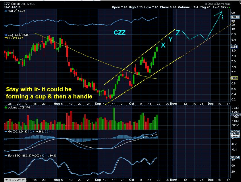 CZZ –  It did NOT dip, it continued higher,  so now CZZ may actually ride up along the upper channel.  It could form a cup here and then a handle.