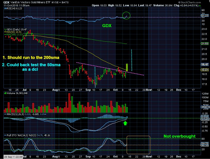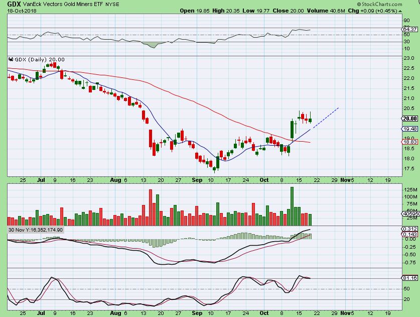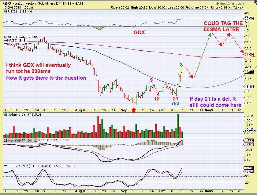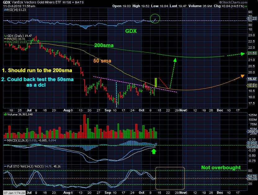 GDX – On Oct 11th, Miners finally surged higher after crawling under  the 50sma. I say finally because even with the inverse H&S , it was choppy under that 50sma.