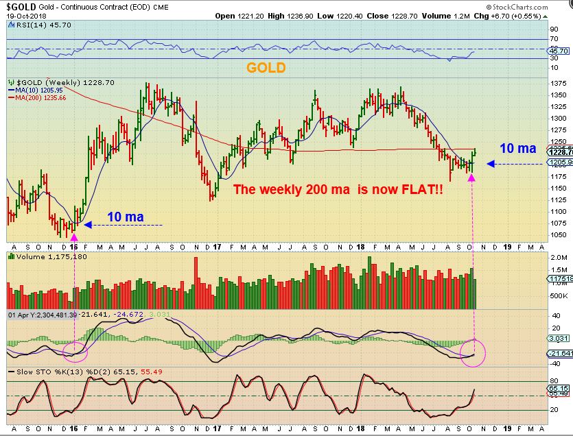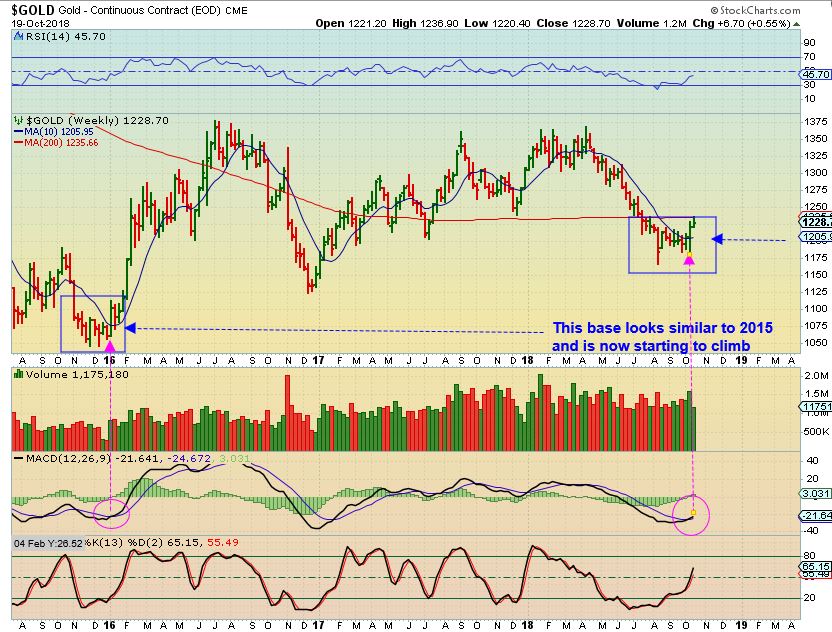 GOLD WEEKLY #1 – I want to compare 2015 with 2018 again. These are 2 nice bases rather than a V-Bottom.  Please study this chart and the 2 bottoms, and then I want you to look at a few things on the next  chart…