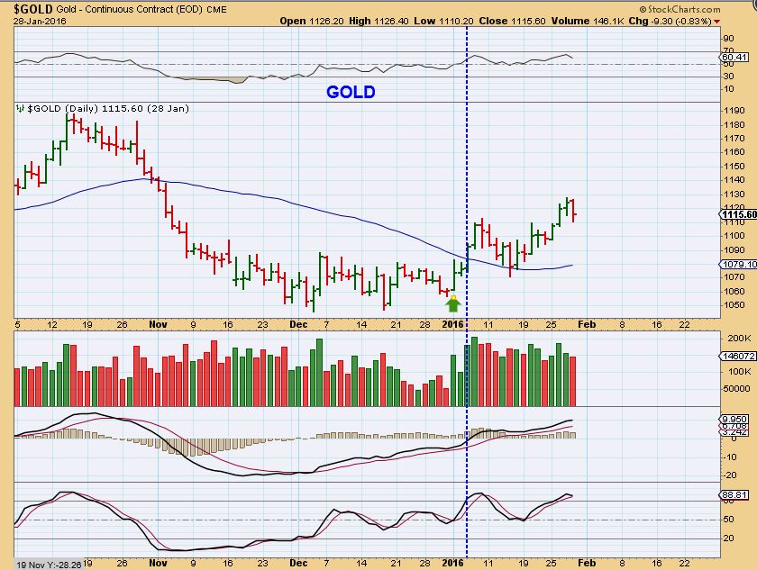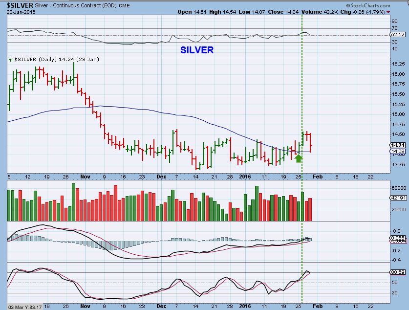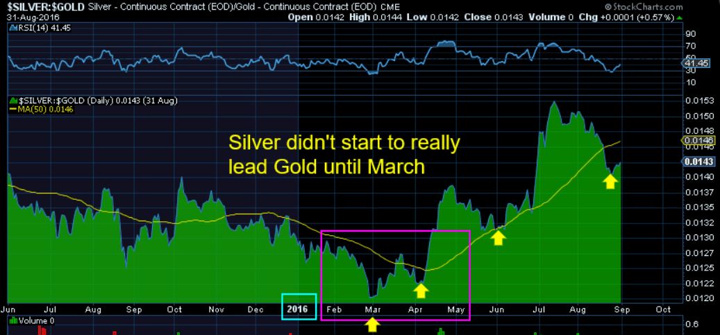 SILVER 2015-2016 –  Silver was still forming a base all through January when Gold took the lead. Silver broke out on Jan 26th – a whole month later.  And that is not all.  Just because Silver broke above the 50sma, does that mean that it Then began leading Gold?  No- remember, GOLD broke the 50sma 3 days into January, so …